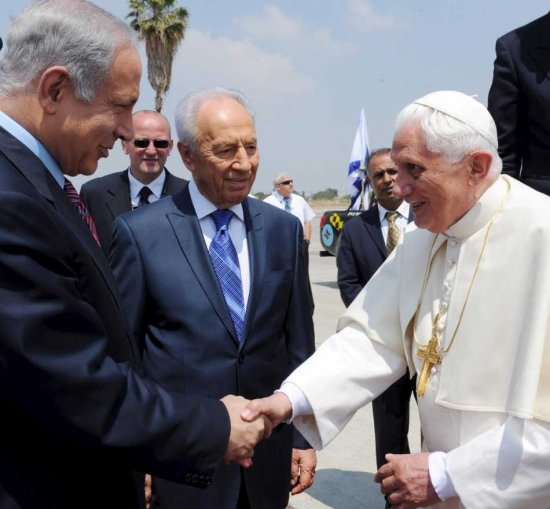The Red Carpet is rolled out for the Pope after his visit to Rome’s foremost business enterpises in the middle east, Israel Incorporated, the Torahless secular State of Israel. Pope Benedict XVI (C) takes part in a farewell ceremony with Shimon Peres (R) and Benjamin Netanyahu (L) at Ben Gurion Airport on May 15, 2009 in Tel Aviv, Israel. The Pontiff now departs after an eight day tour of the Middle East, visiting numerous holy sites. Benjamin Netanyahu;Shimon Peres; Pope Benedict XVI.