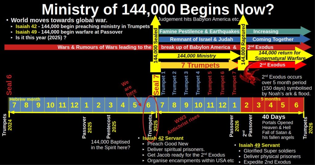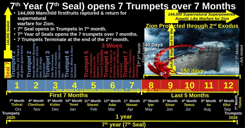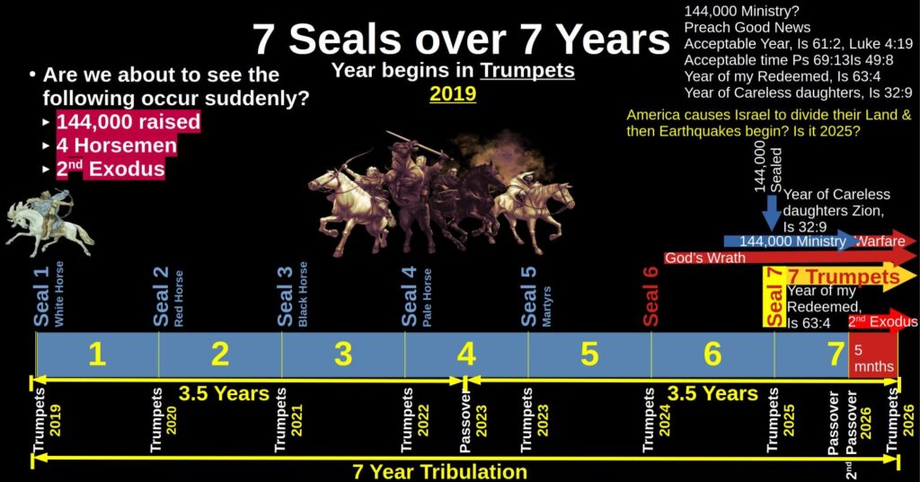 According to this the seventh ‘seal’ opens on the Feast of Trumpets on September 23rd 2025. And the Trumpet judgements occur. The 144,000 must be ‘sealed’ before the ‘four winds blow’ and the first Trumpet is sounded. The 144,000 could be ‘sealed’ during the feast of Sukkot, the feast of Joy as I have often explained in previous blogs.