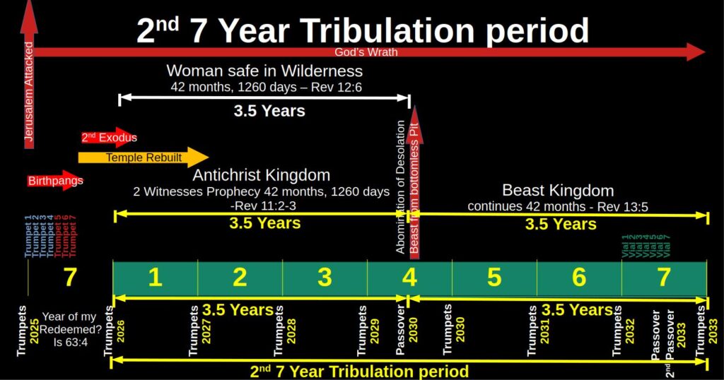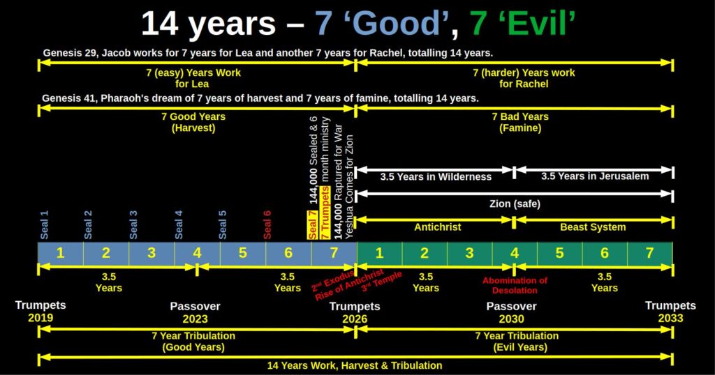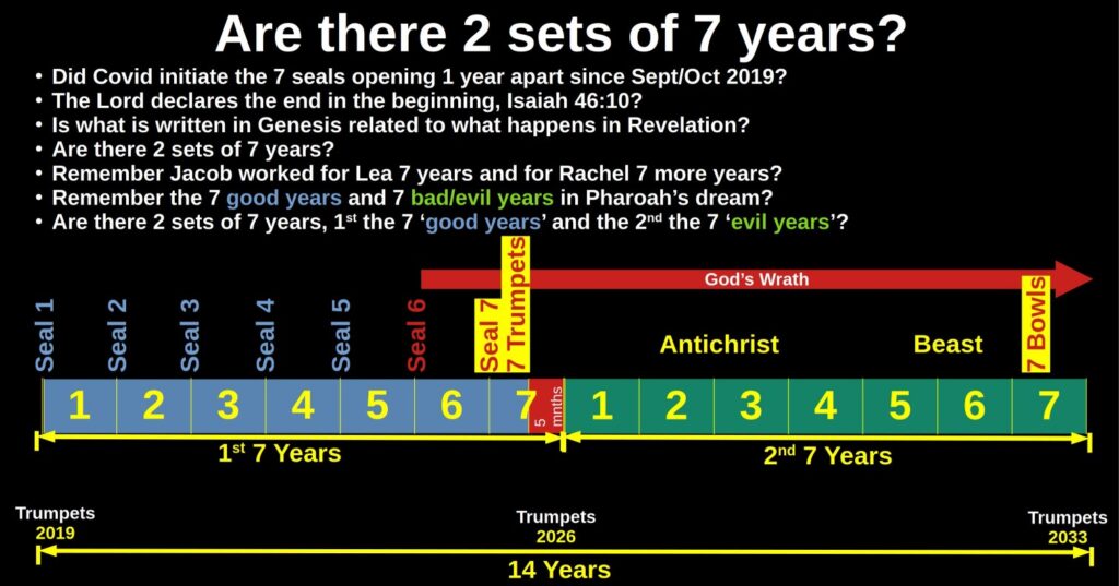 Another major layer to my timeline understanding is that the end time tribulation period is made up of two lots of seven years. This is derived from the fact that Isaiah 46:10 tells us that the end is in the beginning. What is in Revelation is decoded from Genesis. In Genesis we have two accounts of two sets of seven year periods. The first account is that of Jacob working for 7 years for each of his two wives. The second account is Pharoah’s two dreams of 7 good years and 7 evil. I won’t go into the details here but suffice to say, we may be in the 6th year of the first set of 7 years we may be just about to enter the seventh year of the first seven year period which will begin the 7 trumpet judgements over 7 months culminating in the 2nd Exodus next year in May 2025 at the time of 2nd Passover.