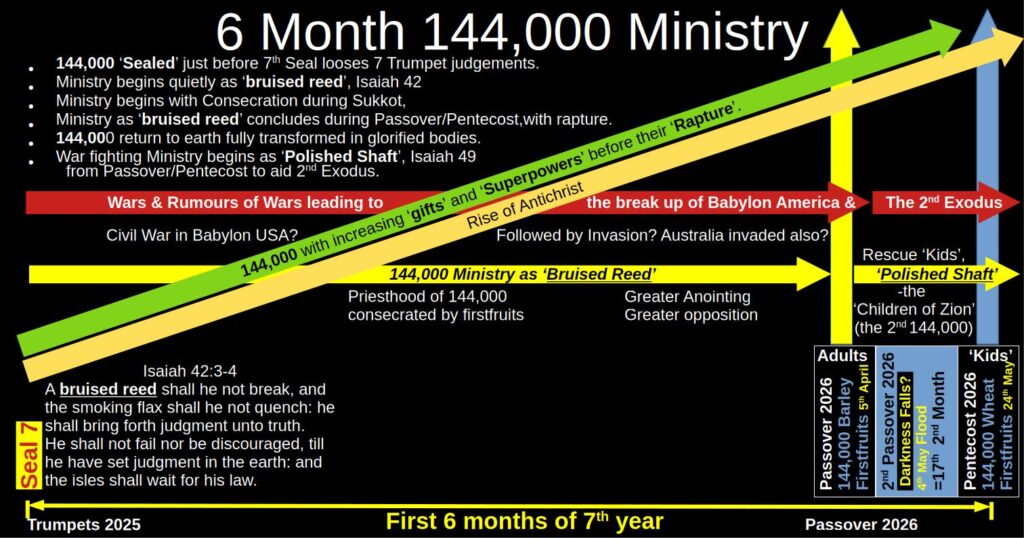 The 144,000 Barley harvest workers are sealed to preach the gospel and do signs and wonders as per Isaiah 42, they are operating like Yeshua as the ‘bruised reed’ to get the 2nd Exodus underway and bring people to repentance. This will thus be a short work, because there are only seven months to go before the second exodus, if the seven trumpet judgements are released one month apart. The preaching that they do is during the winter months when the barley is growing in the ground, as the rains come. Hence we are moving into a time where the Holy Spirit is active and bringing souls into the Kingdom as our world falls apart over these seven months of preparation.