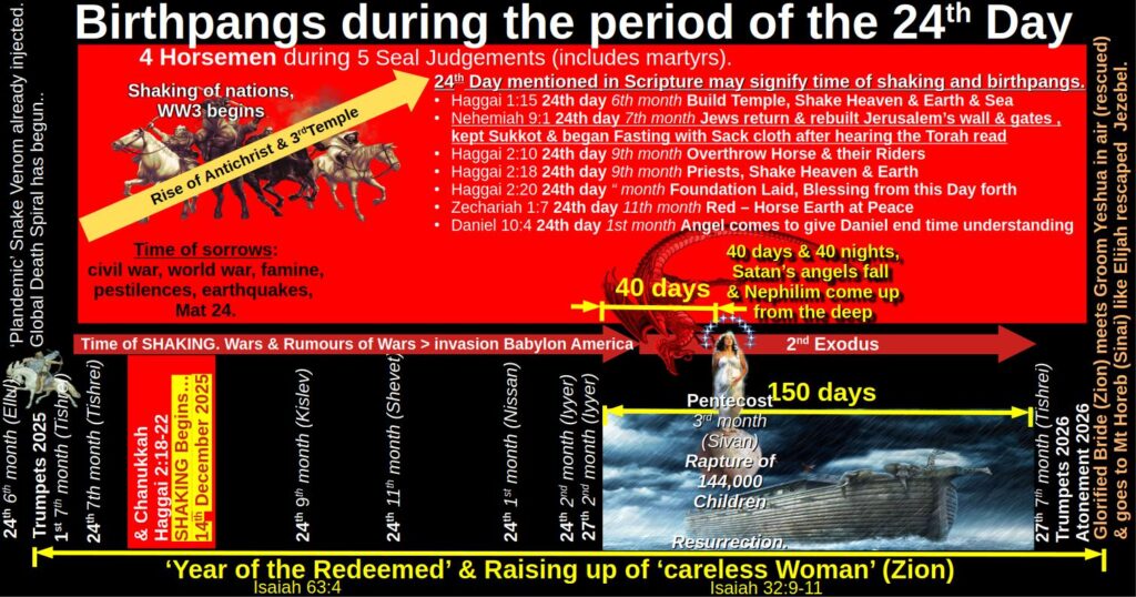 If you string all the months that the 24th day appear on in Haggai and elsewhere you get a period of 8 months from the 24th day of the 6th month, Elul (a week before the feast of Trumpets) to the 24th day of the 1st month, Nissan. Now 24 is related to priesthood and betrothal. And 8 means circumcision and a new beginning. These 8 months are just one month before the flood came in the 2nd month. Now pregnancy takes 9 months. So we are missing a ‘24th day’ of the 2nd month until the 2nd Exodus. Could it be that the 2nd Exodus begins on this day? Could this be a new man made feast to commemorate the 2nd Exodus on the 2nd month? Would this be another ‘Yom Tov’ day like Hanukkah and Purim? Just conjecture at this stage. Nevertheless, 2nd Passover mentioned in Numbers 9 will have an end time fulfilment as I have discussed before and I believe this will be the beginning of the 2nd Exodus.
