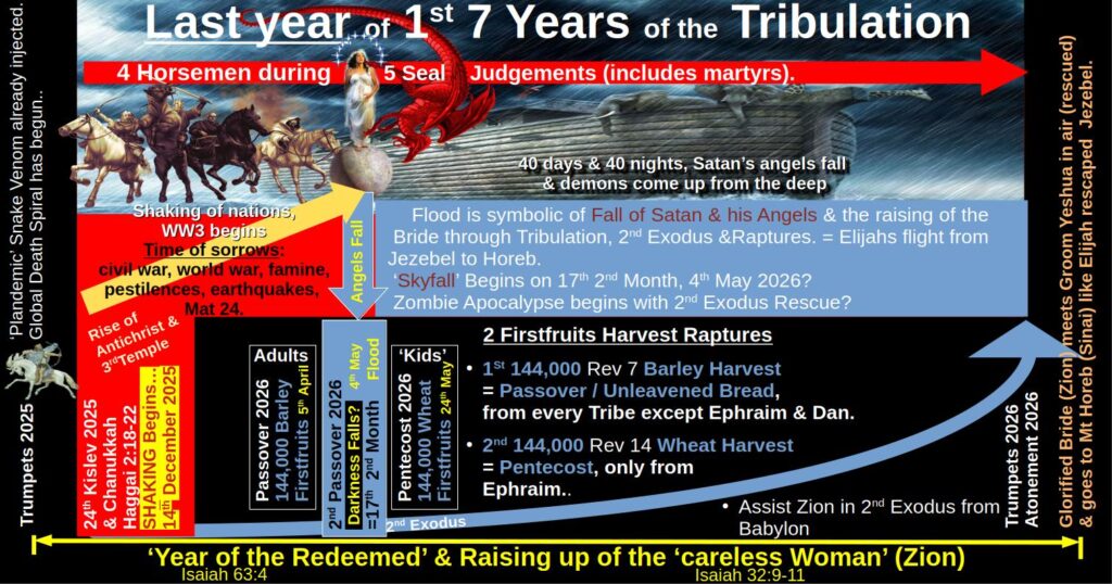 I want to also say what my focus is on here in these timeline charts. Although the ‘rapture’ is an event many speculate about, and although my timelines address this, it is not the main focus here. My main focus has always been what is happening on the ground concerning the 2nd Exodus of Israel and Judah. I know that there is a wedding in heaven also. Many Israelites and gentiles shall be there via death or ‘rapture’. The book of Revelation is unique in that it gives us a view of things occurring in Heaven as well as on the earth. The ‘rapture’ or ‘raptures’ are related to, and very much occur around, the events on earth concerning Israel and the 2nd Exodus. For example, the 144,000, the ‘manchild’ of Revelation 12, will be ‘raptured’ for battle at the 2nd Exodus as the Dragon and his angels come down to earth. I believe that the 3 pilgrimage festivals in Deuteronomy 16:16, Unleavened Bread, Pentecost and Tabernacles are the 3 times we are gathered before the Lord in heaven and thus various ‘raptures’ will occur on these dates for the 144,000 or the ‘Bride’ or the ‘brides maids’ or the ‘guests’. Of course all the other feast dates are candidates for rapture, especially trumpets and Yom Kippur. But I am looking at the events of Revelation with an eye on the 2nd Exodus which is the escape of the ‘Woman’ from the Dragon in Revelation 12. This ‘Woman’ is ‘Zion’, she is the Israelite ‘Bride’. Before her escape happens the 7 seals and 7 trumpet judgements must occur.