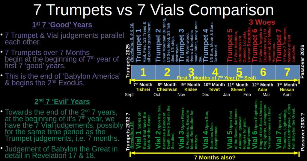 Compare the above and meditate upon on it. Are these two sets of very similar judgements 7 years apart? The first 7 ‘good’ years end with 7 Trumpet judgements and the second 7 ‘evil’ years end with very similar but more severe Vial/Bowl judgements. In both 7 year periods there is the judgement of ‘Babylon’. The first seven ‘good’ years end with the judgement of ‘Babylon America’ while the second seven ‘evil’ years end with the destruction of the Beasts Kingdom of a rebuilt ‘Babylon’ in the land of ‘Shinar’.